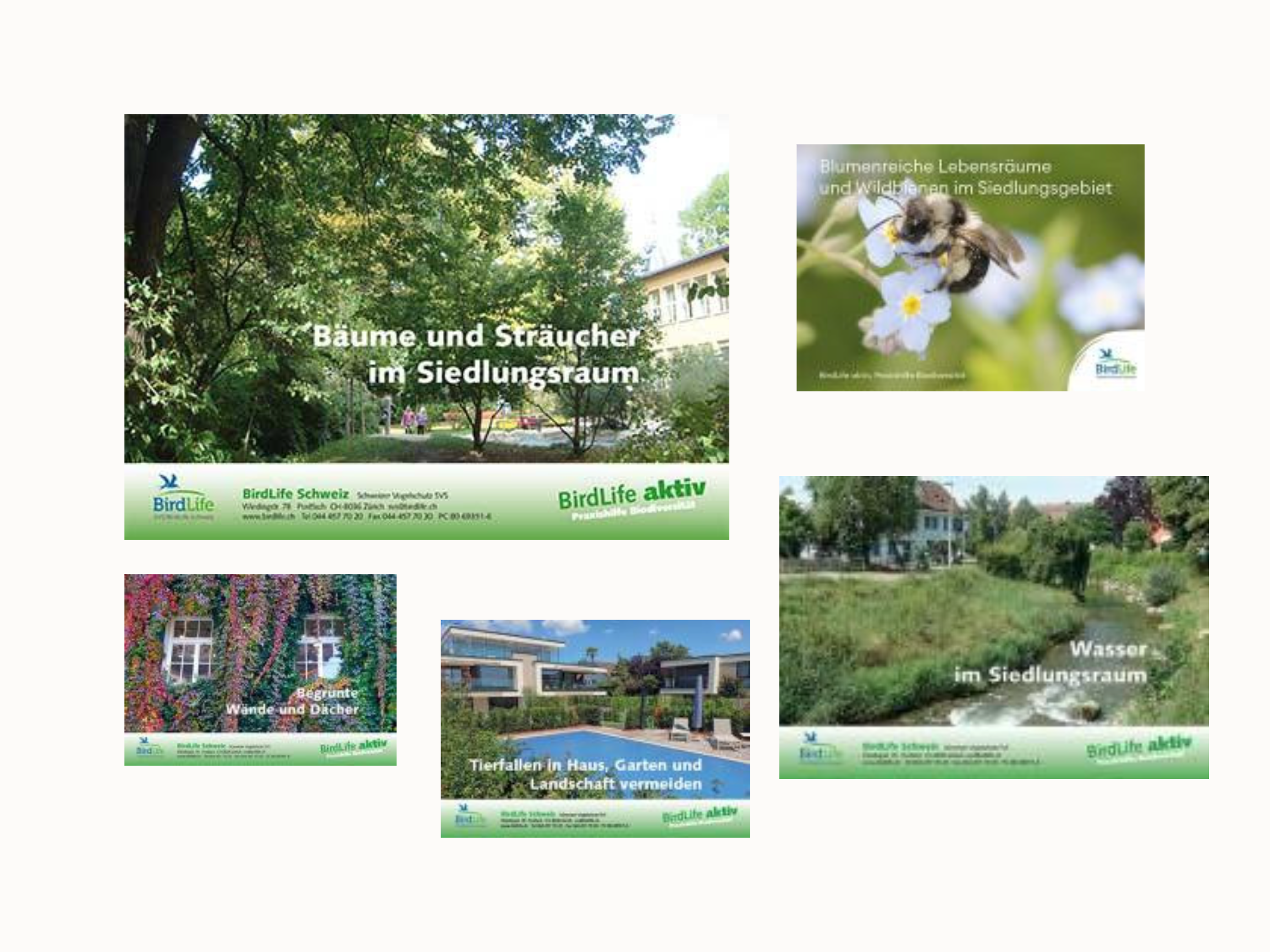BirdLife Schweiz hat zu diversen Themen Praxishilfen erarbeitet, welche kostenlos als PDF verfügbar sind oder in Papierform bestellt werden können: - Bäume und Sträucher im Siedlungsraum - Begrünte Wände und Dächer - Blumenreiche Lebensräume und Wildbienen - Tierfallen in Haus, Garten und Landschaften vermeiden - Wasser im SiedlungsraumPreis