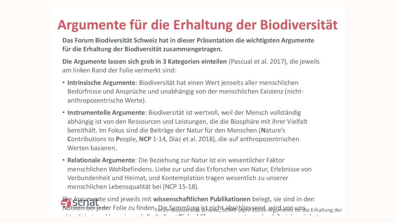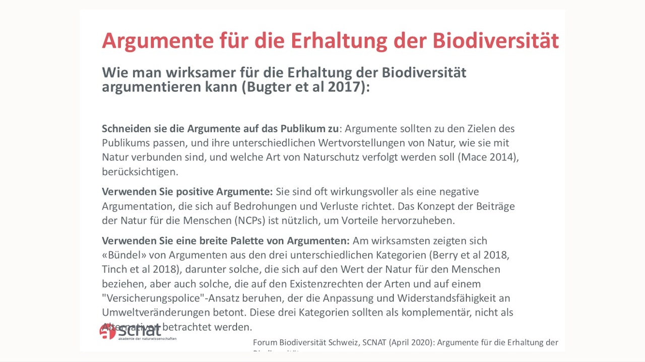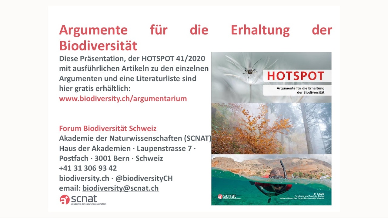 Das Forum Biodiversität Schweiz hat diese Powerpoint-Präsentation mit den wichtigsten Argumenten zum kostenlosen Herunterladen und Weiterverwenden zusammengestellt. In ihrer Zeitschrift HOTSPOT (Ausgabe 41/20) findest du ausserdem ausführliche Beiträge zu den wissenschaftlich begründeten Argumenten zum Erhalt der Artenvielfalt.