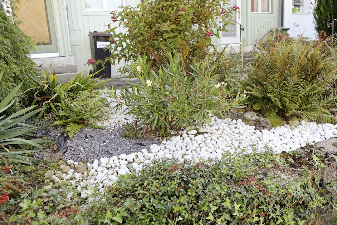 Schütten Sie nie Kies, Sand oder sonstiges Material auf die Humusschicht (Oberboden, «Erde»). Diese oberste, belebte Schicht von 5–30 cm ist immer vorgängig zu entfernen und anderweitig im Garten zu verwenden. Sie erkennen den Humus an der dunklen Färbung, der darunterliegende Unterboden ist heller gefärbt.