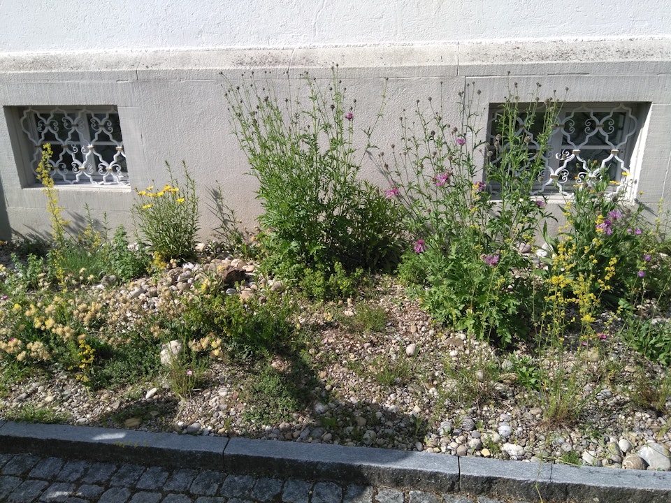 • Einsaat oder Pflanzung von Pionierarten und einheimischen Wildblumen (z. B. Mauerpfeffer, Natterkopf, Wegwarte).
