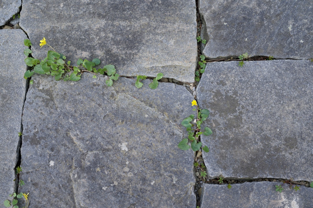 Begrüne Kiesflächen am Rand oder säe Wildpflanzen ein – und lass Breitwegerich oder Thymian durch die Pflasterfugen wachsen.