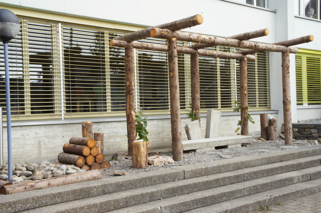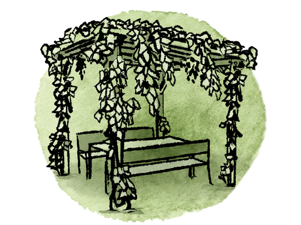 Vielfalt und Kühlung dank begrünter Pergola und Unterstände