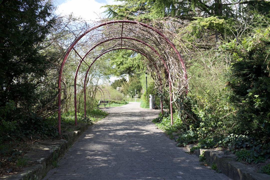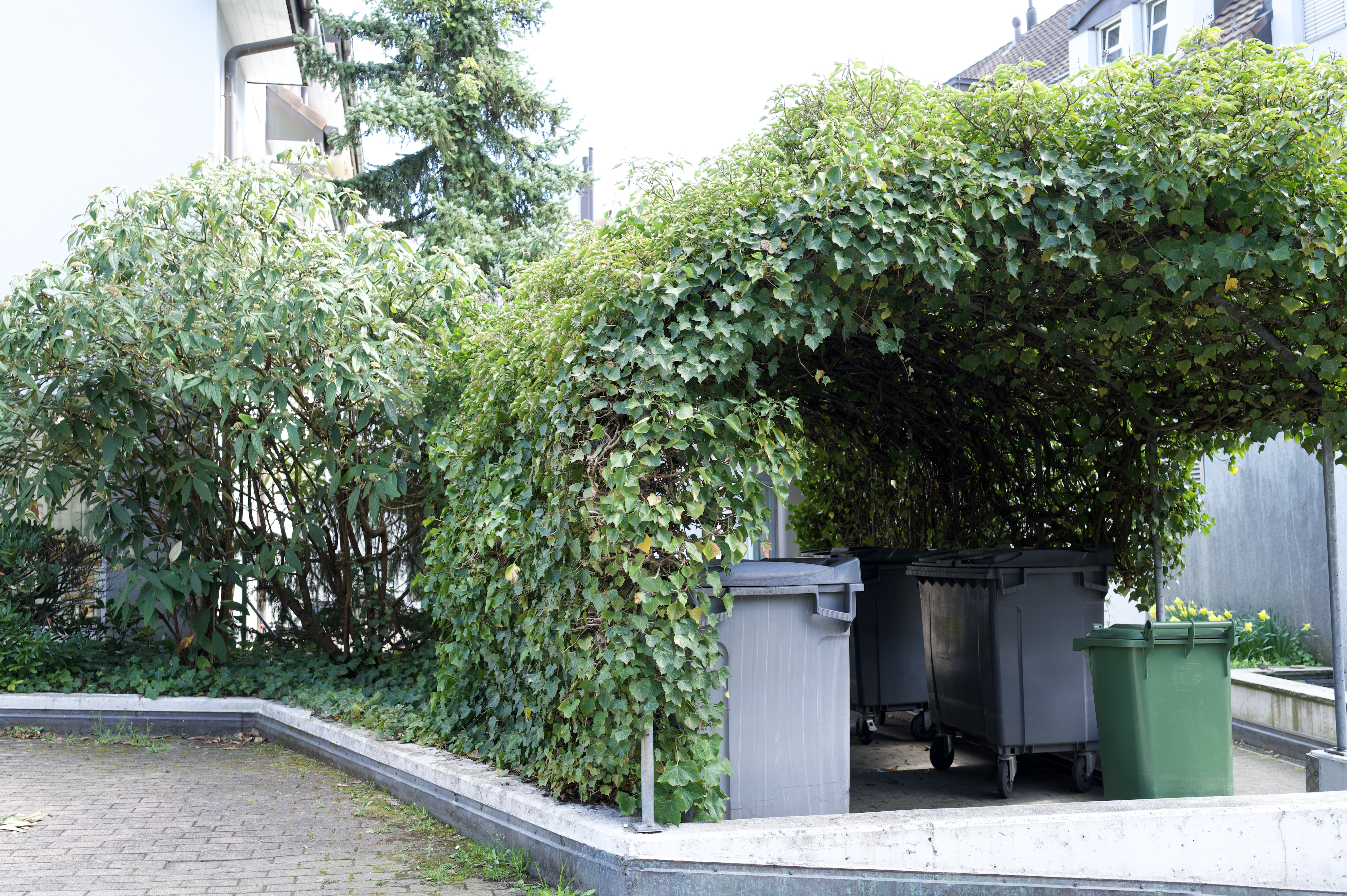 Pflanze Kletterpflanzen wie Efeu, Hopfen oder Waldrebe an die Stützen. Mit Rankhilfen schaffst du zusätzlichen Lebensraum in der Vertikalen.